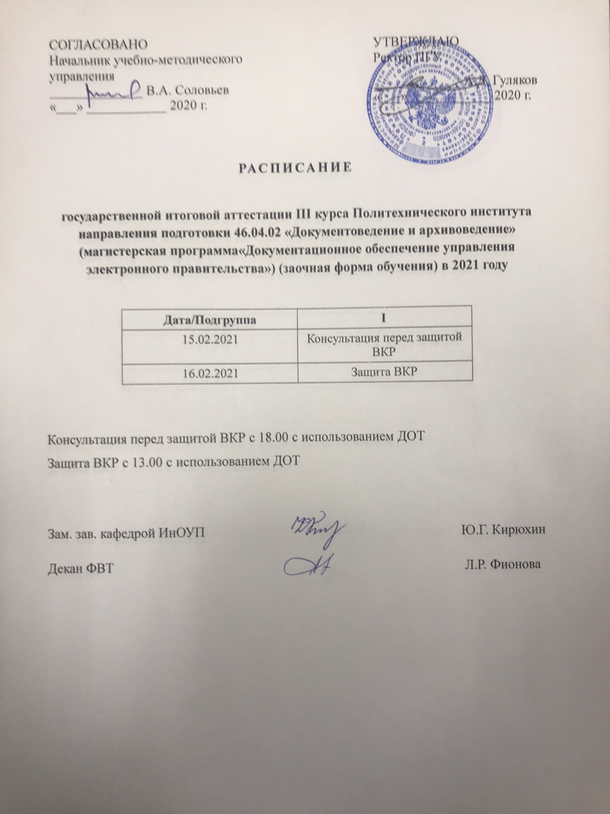 Расписание ГИА II курса 46.04.02 "Документоведение и архивоведение", магистерская программа "Документационное обеспечение управления в органах власти" очной формы в 2024 году