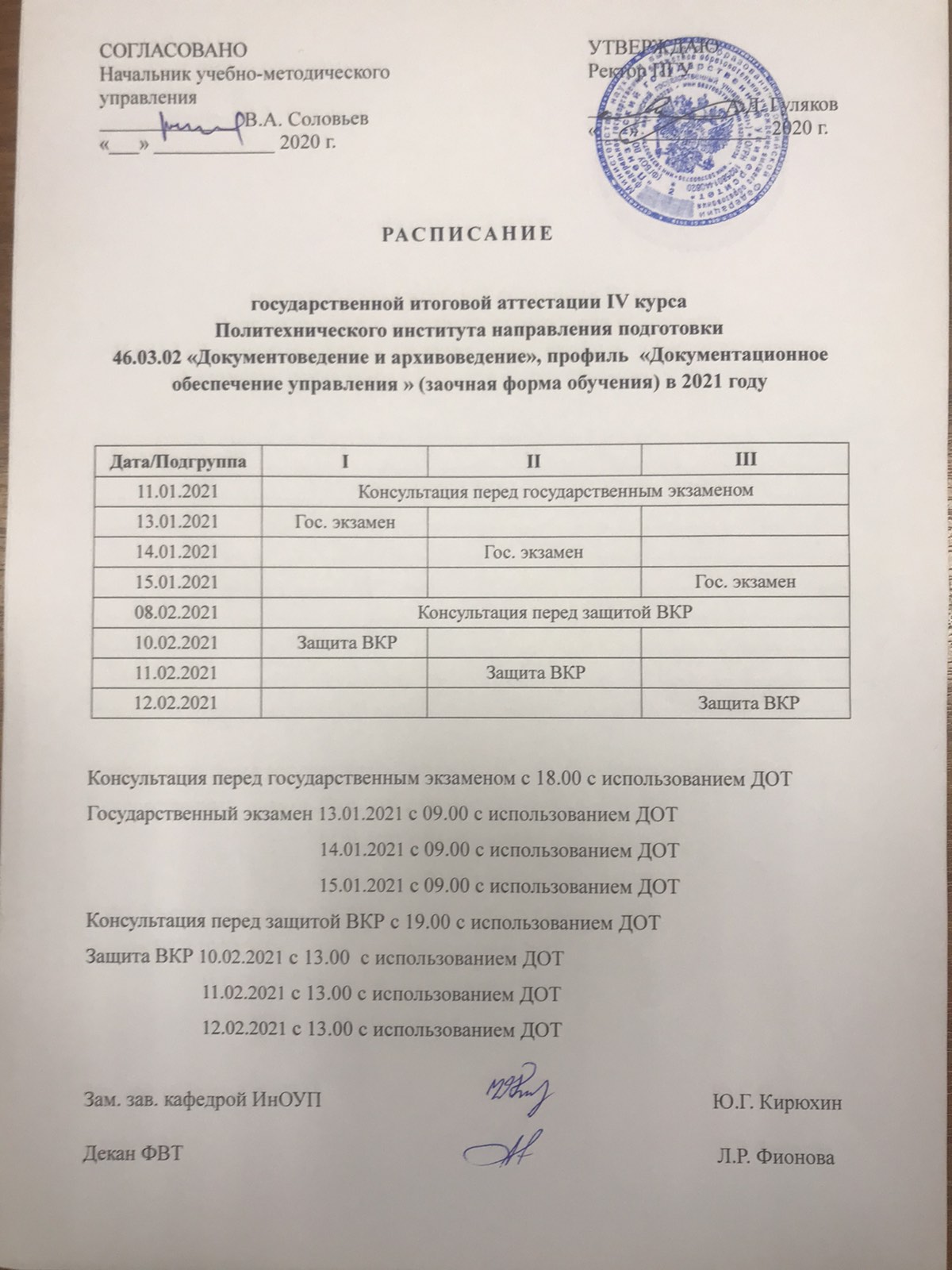 Расписание ГИА IV курса 46.03.02 "Документоведение и архивоведение", профиль обучения "Документационное обеспечение управления" очной формы в 2024 году
