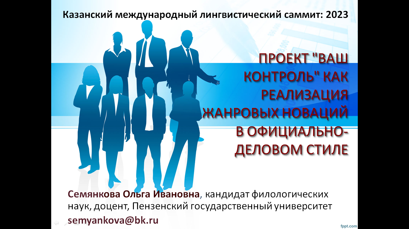 Кандидат филологических наук, доцент кафедры ИнОУП О.И. Семянкова приняла участие в этом масштабном мероприятии и в рамках секционного заседания онлайн представила доклад на тему «Проект "Ваш контроль" как реализация жанровых новаций в официально-деловом стиле».