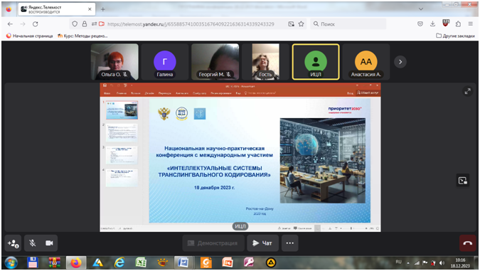 Доцент кафедры ИнОУП О.И. Семянкова выступила с очным онлайн-докладом на Национальной научно-практической конференции с международным участием «Интеллектуальные системы транслингвального кодирования»