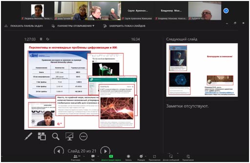 С основным докладом выступила заместитель генерального директора ООО «ДИМИ-ЦЕНТР», доктор исторических наук Юлия Юрьевна Юмашева, тема доклада: «Технологии искусственного интеллекта в практике работы архивов: российский и зарубежный опыт».