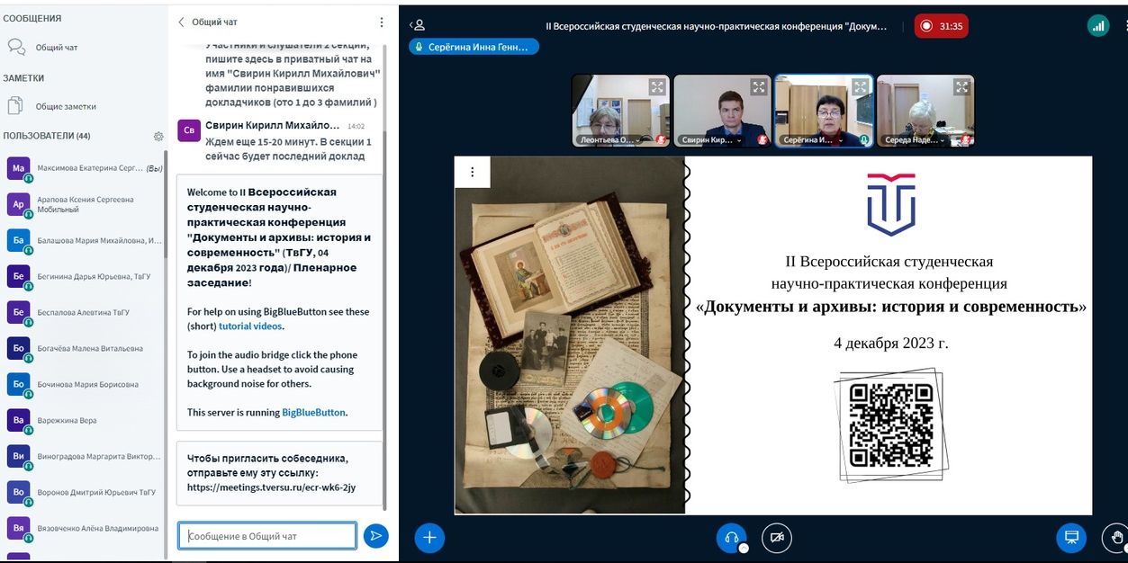4 декабря 2023 г. студентка группы 21ВД1 Максимова Екатерина приняла очное онлайн-участие во II Всероссийской студенческой научно-практической конференции «Документы и архивы: история и современность».