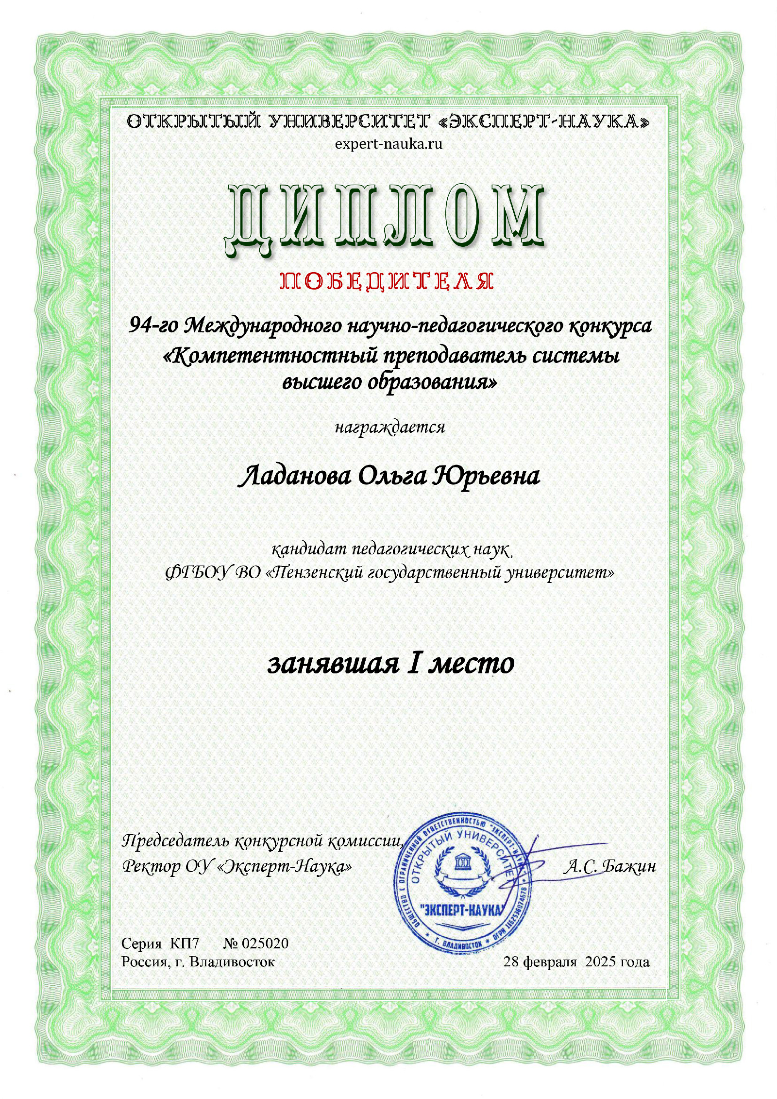 Конкурс проводился Открытым университетом "Эксперт-Наука" дистанционно и охватывал различные направления, включая лучшие научные исследования, образовательные проекты и культурно-просветительские инициативы. Ольга Ладанова, доцент кафедры ИнОУП, к.пед.н. принимала участие в конкурсе «Компетентностный преподаватель системы высшего образования» и заняла 1-ое место, получив Диплом побелителя.