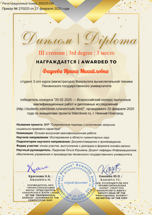 Конкурс проводился 20.02.2025, в нем принимало участие 133 студента Ирина Фадеева очно дистанционно представила магистерскую диссертацию «Современные подходы к исполнению запросов социально-правового характера» в номинации «Лучшая выпускная квалификационная работа» и заняла 3-е место.